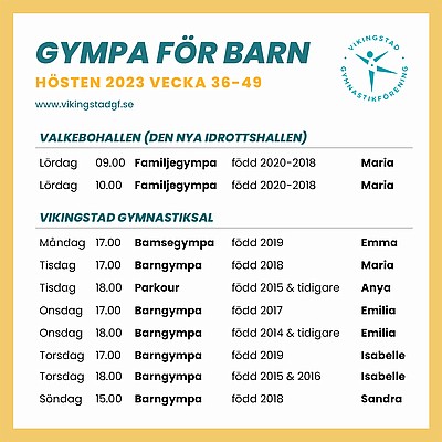Välkommen till höstterminen hos oss i Vikingstad gymnastikförening, som startar vecka 36 och håller på fram till och med vecka 49. Barngymnastik