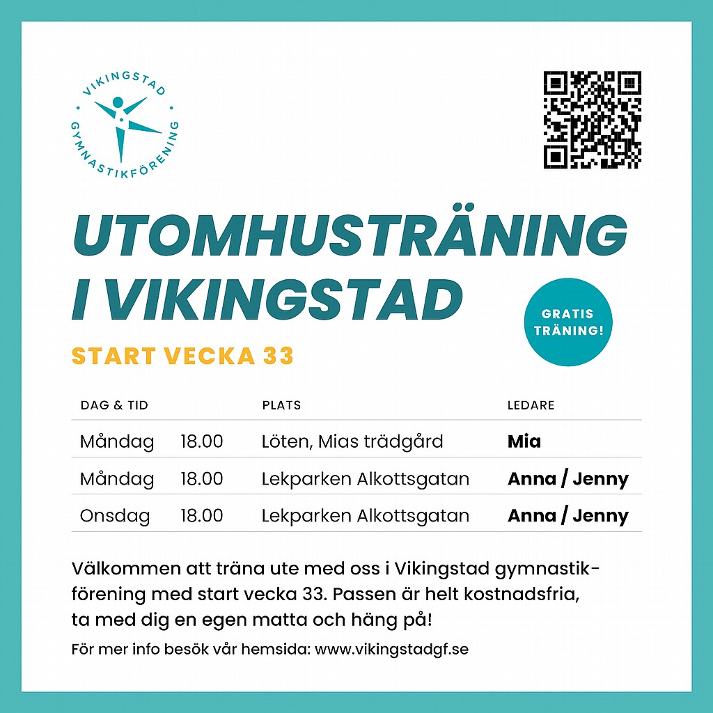 Vecka 33 drar vi igång med utomhusträning igen! På måndagar och onsdagar kl 18.00 kör Anna eller Jenny ett pass vid lekparken på Alkottsgatan. Och på måndagar kl 18.00 kör även Mia ett pass i hennes trädgård i Löten.