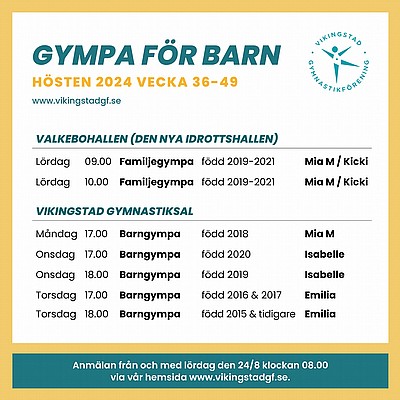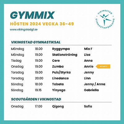 Välkommen till höstterminen hos oss i Vikingstad gymnastikförening, som startar vecka 36 och håller på fram till och med vecka 49.